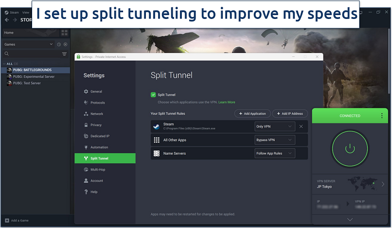 - Split tunneling. Route only PUBG through the VPN while keeping other apps on your regular connection for better overall performance.
