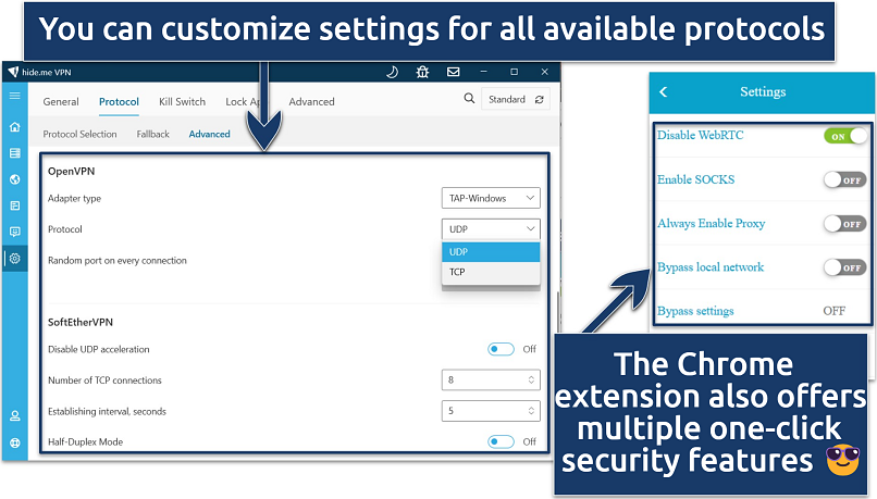 hide.me's free offers a wide variety of security features to protect your Chrome sessions. These features include strong encryption, leak protection, and the option to choose between 5 internet protocols. Wireguard gave us the best speeds during our tests, but it was a little slower than Avira overall.