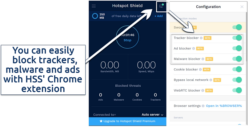 Hotspot Shield’s Chrome extension has several bonus security features. Meanwhile, its Sword feature feeds fake data to web trackers to increase your online privacy. In my tests, I could block WebRTC traffic, ads, malware, cookies, and trackers. However, like hide.me, the Chrome extension is only a proxy. Plus, it only offers one location in the US.