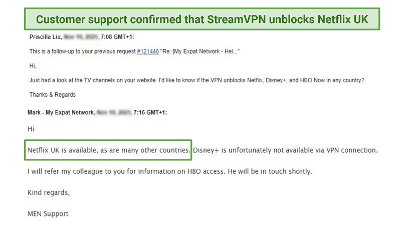 After I sent a follow-up email about HBO Now, the representative confirmed that StreamVPN can’t unblock the platform