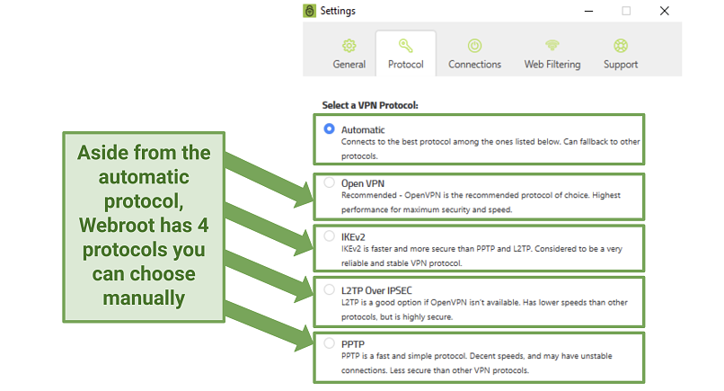 Webroot works with 4 major protocols. Here is a look at the settings menu on the PC app, where you can see all the available protocols.