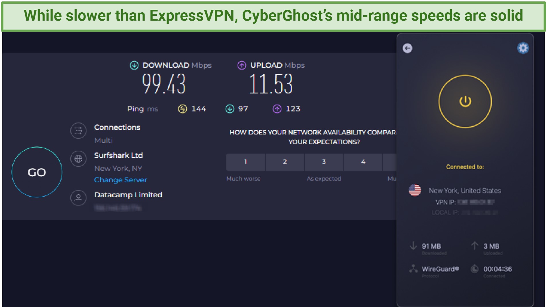 Fast speeds. I ran speed tests on multiple servers from both providers, which you can do as well using free online tools. ExpressVPN was generally faster, but CyberGhost also had a respectable performance.