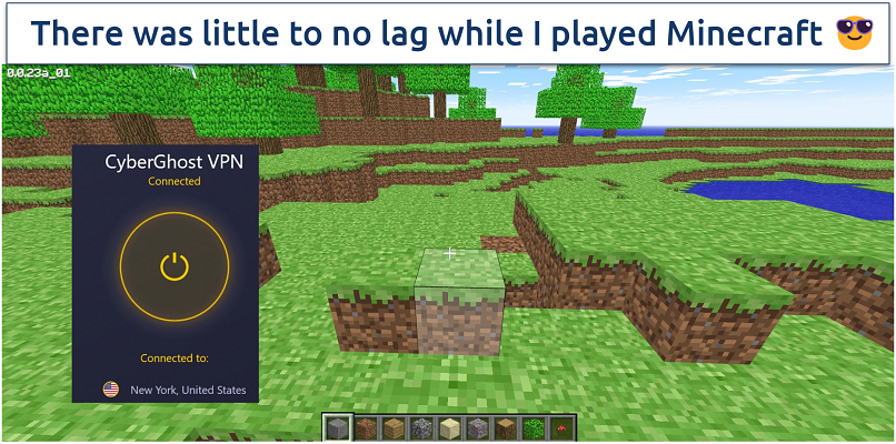 CyberGhost also offers servers optimized for gaming, but I didn’t notice much difference between them and the regular servers. Regular and optimized servers in the same regions had almost similar ping. For instance, all CyberGhost servers in the US had a ping of between 70-80 ms, which allowed me to play Minecraft without any issues.