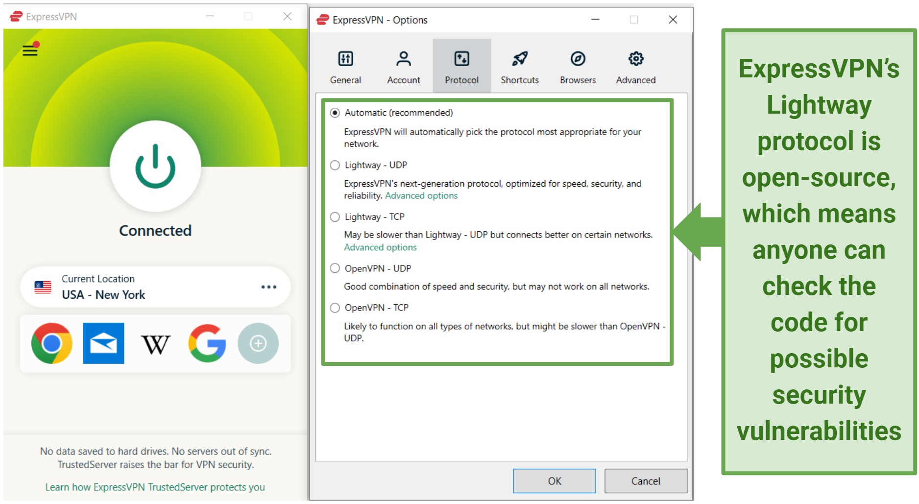 ExpressVPN and StrongVPN use AES 256-bit encryption — the strongest available. Plus, both VPNs offer a selection of secure VPN protocols to choose from. ExpressVPN offers OpenVPN (UCP and TDP), IKEv2, and its own Lightway protocol (based on WireGuard) that’s built for fast speeds and security.