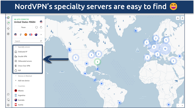 The map interface helps you to see how far away a server may be from you